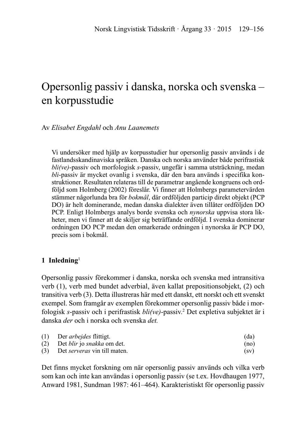 - Opersonlig passiv i danska, norska och svenska: En grammatisk konstruktion i skandinaviska språk.